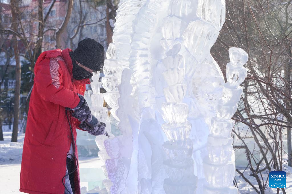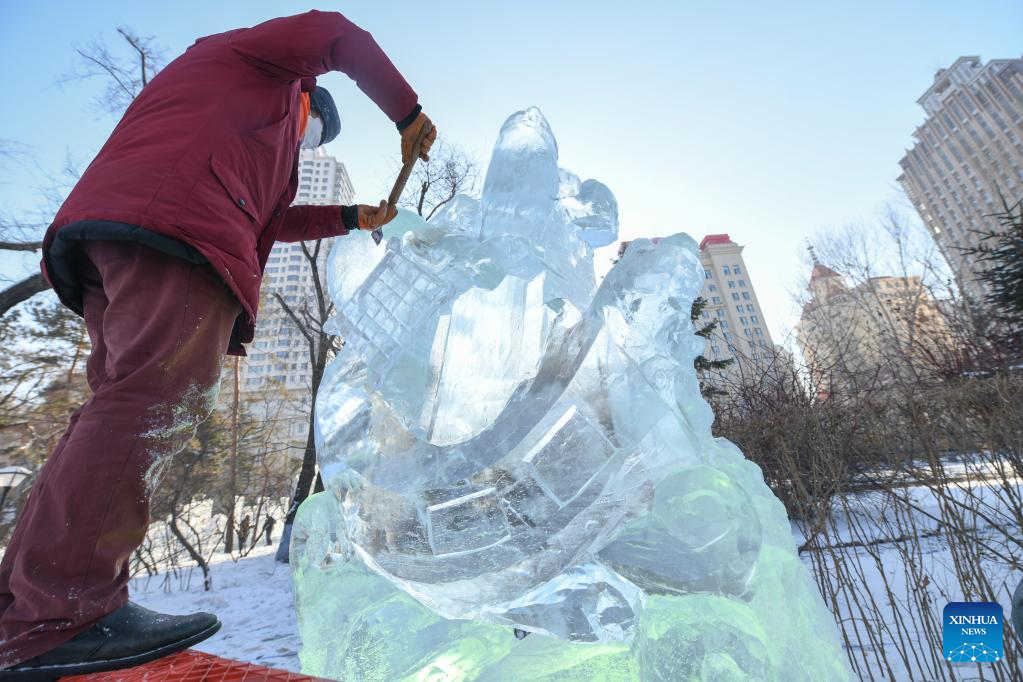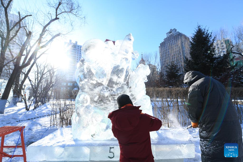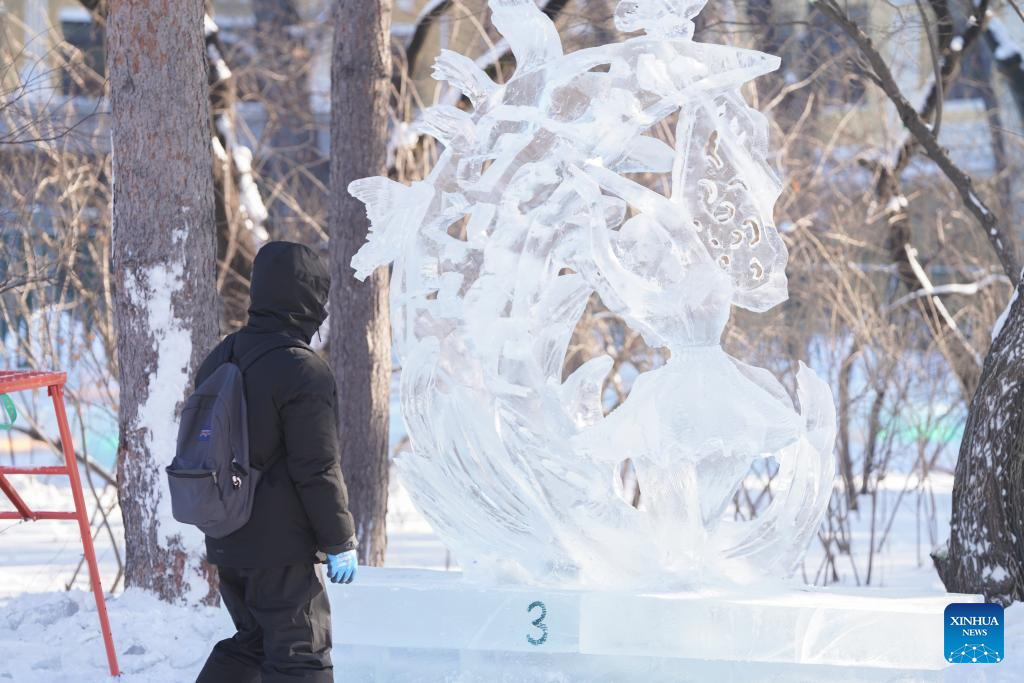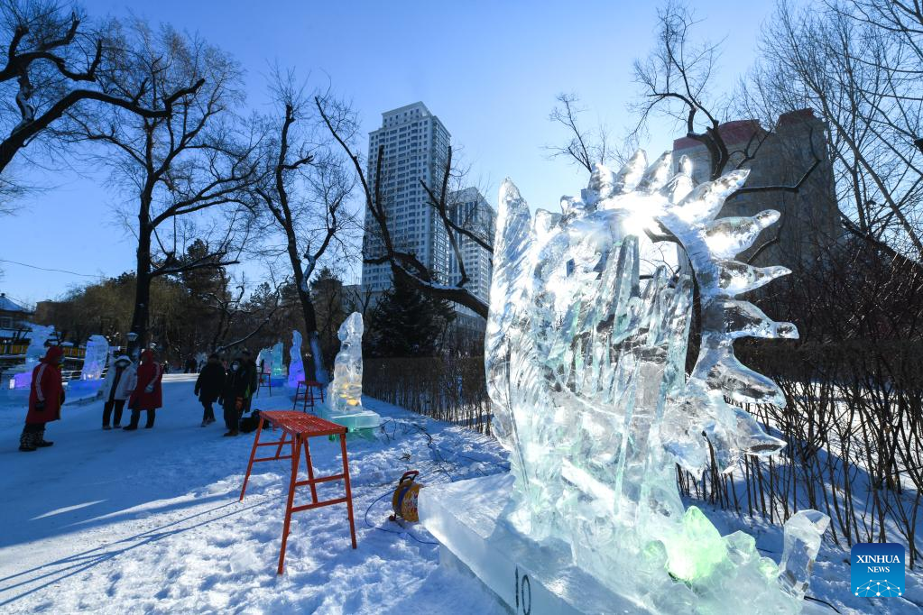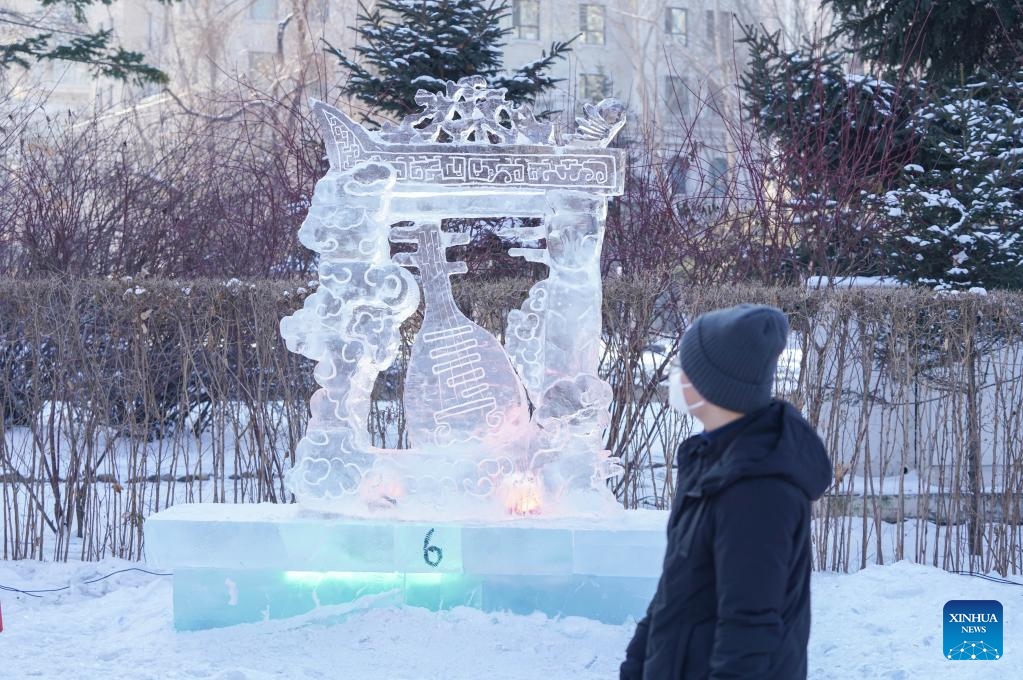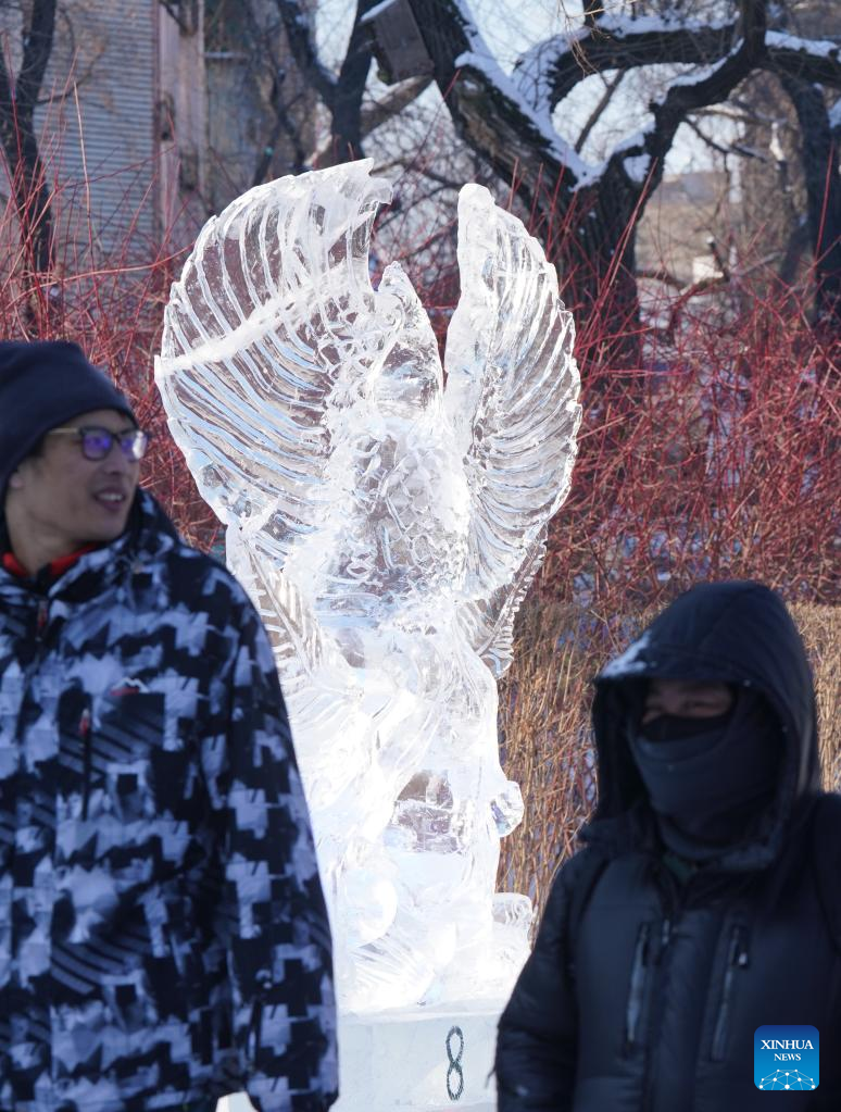 A prize-winning ice sculpture is seen during a national college students' ice sculpture contest in Harbin, northeast China's Heilongjiang Province, Dec. 31, 2022. (Xinhua/Wang Song)