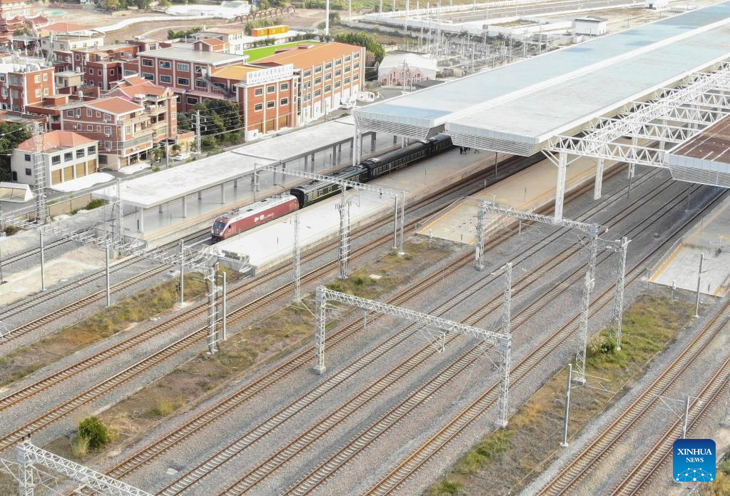 The train T8010 is seen at Quanzhou railway station in Quanzhou, southeast China's Fujian Province, Dec. 30, 2022. (Xinhua/Zhou Yi)