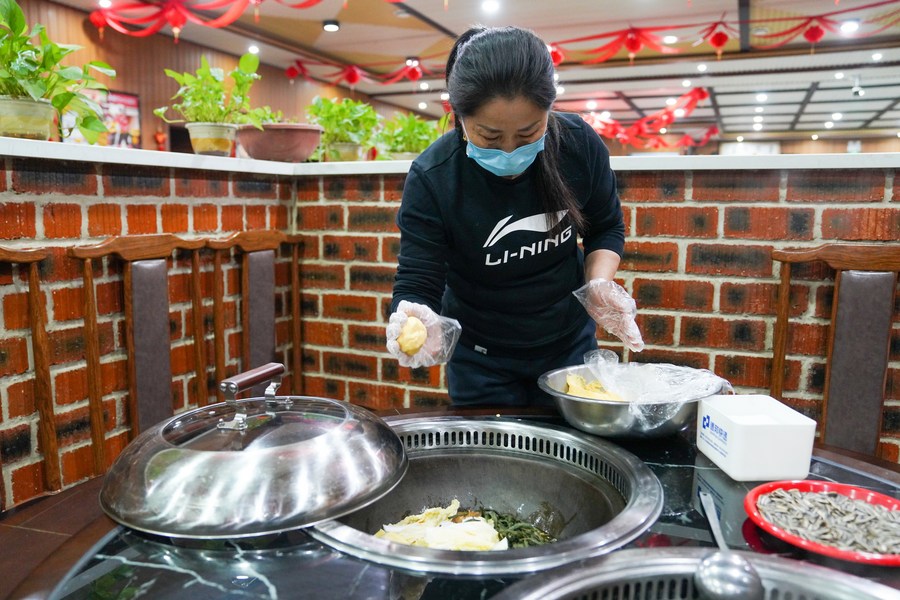 Yu Shufen prepares a meal for guests at her restaurant near the Beidahu Ski Resort in Jilin City, northeast China's Jilin Province, Nov. 21, 2022. (Xinhua/Yan Linyun)