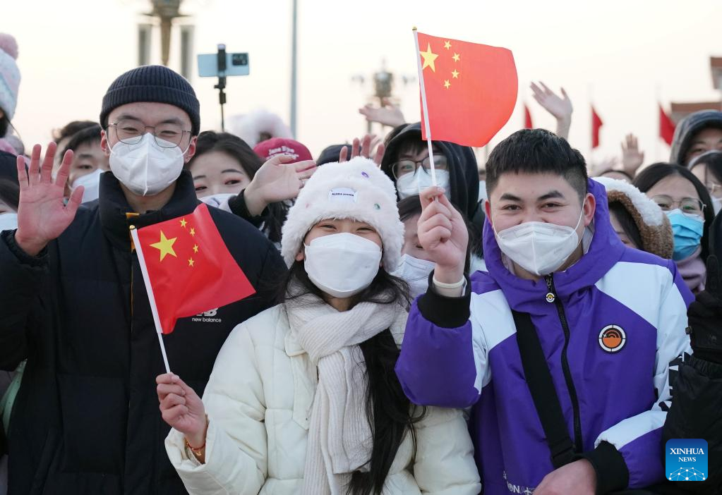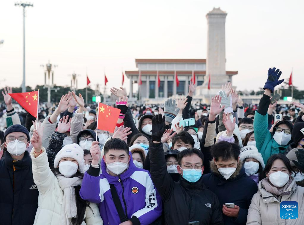 People cheer after a national flag-raising ceremony was held at the Tian'anmen Square in Beijing, capital of China, Jan. 1, 2023. The ceremony was part of the celebrations for the New Year's Day. (Xinhua/Zhang Chenlin)