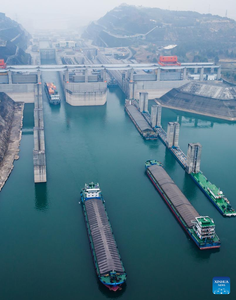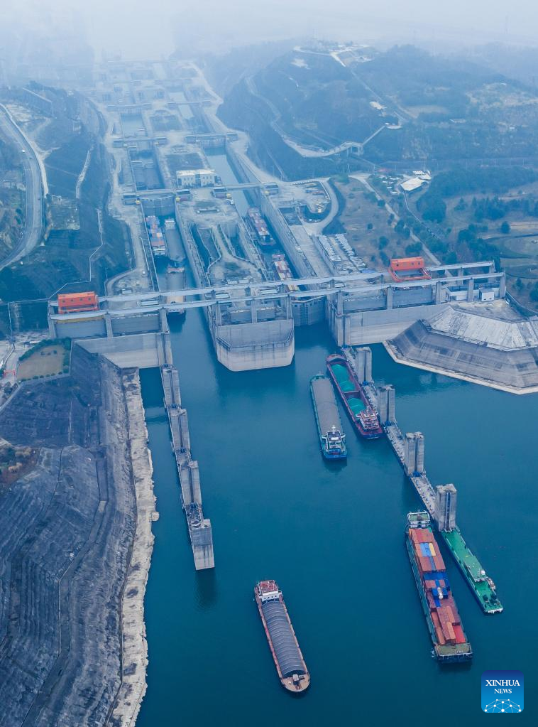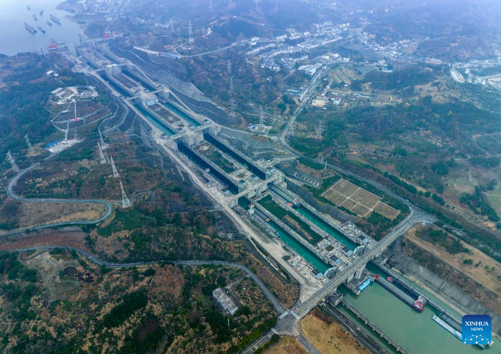 This aerial photo taken on Jan. 2, 2023 shows ships passing through the five-tier ship locks of the Three Gorges Dam in Yichang, central China's Hubei Province. (Photo by Wang Gang/Xinhua)
