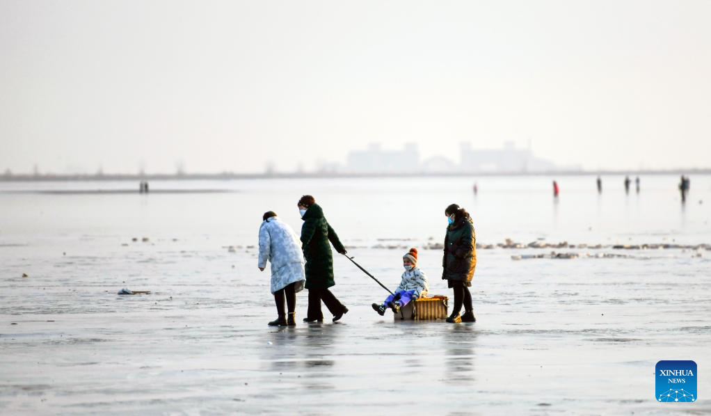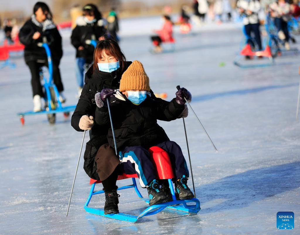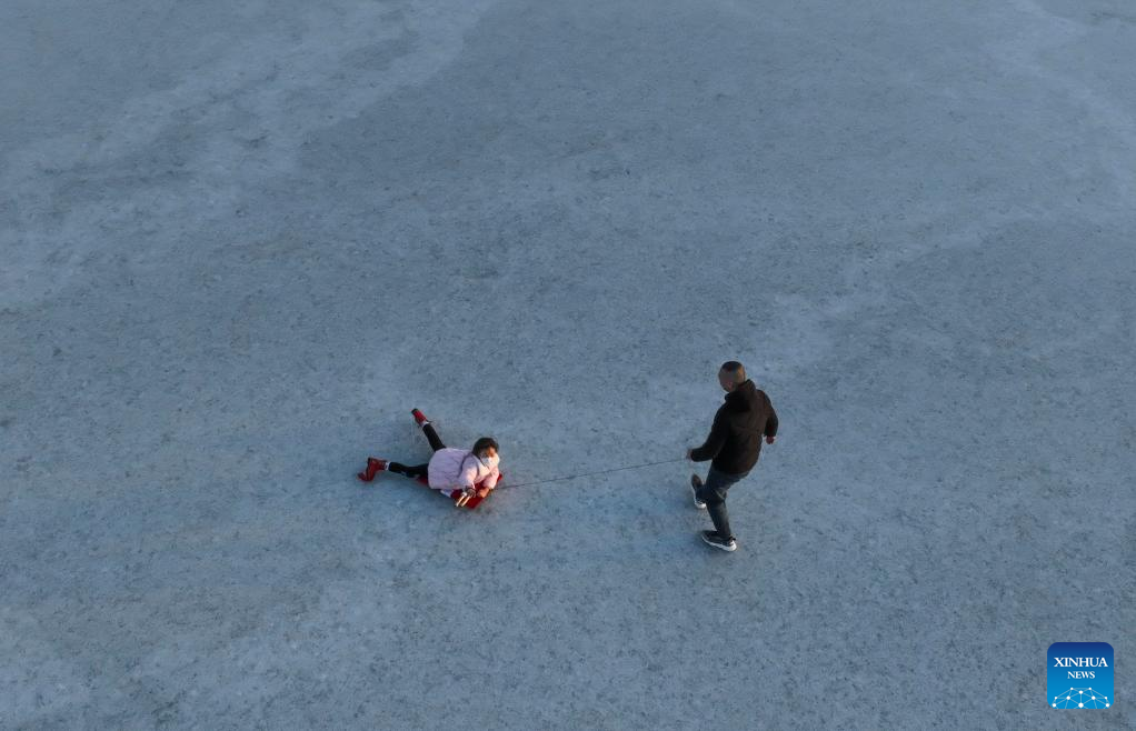 People have fun on the ice in Tangshan Haigang Economic Development Zone of Tangshan, north China's Hebei Province, Jan. 2, 2023. (Photo by Liu Mancang/Xinhua)