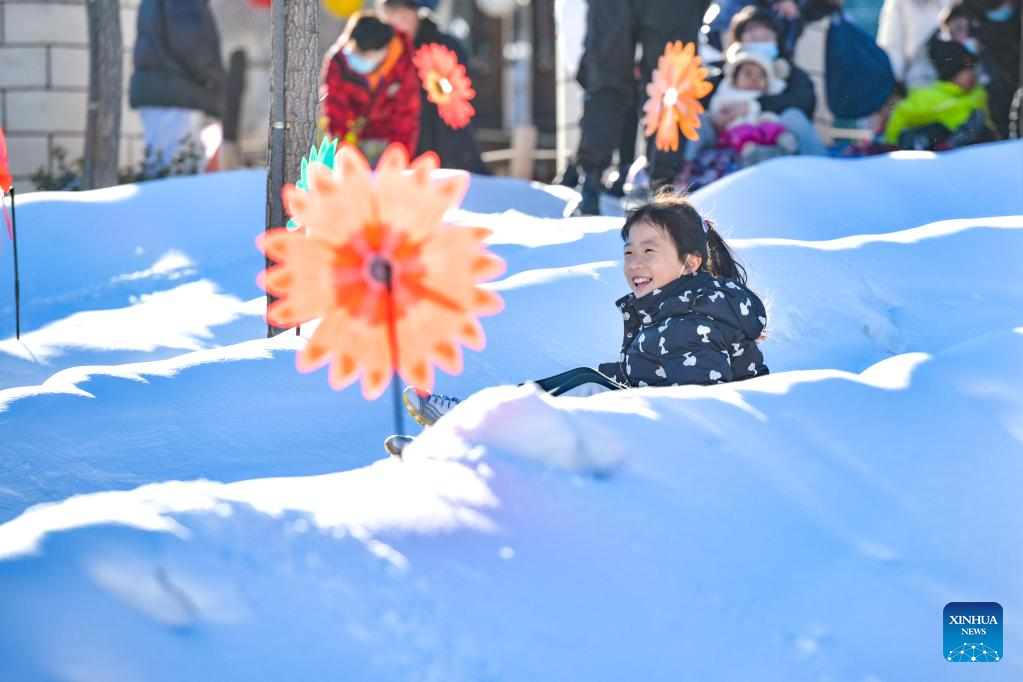 A child enjoys a snow activity at a theme park in Jizhou District, north China's Tianjin, Jan. 2, 2023. (Photo by Wang Jinyi/Xinhua)
