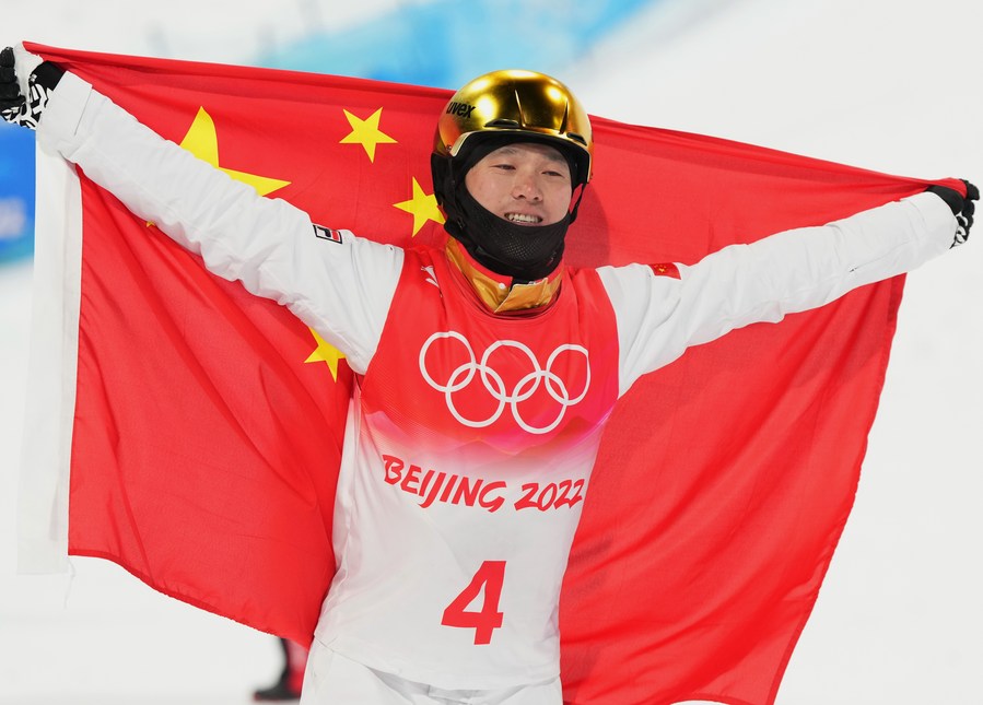 Qi Guangpu of China celebrates after winning the freestyle skiing men's aerials final at the Beijing 2022 Winter Olympics at Genting Snow Park in Zhangjiakou, Feb. 16, 2022. (Xinhua/Yang Shiyao)