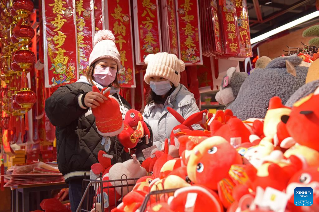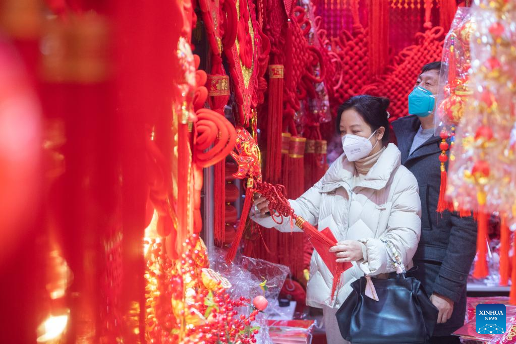 People select new year decorations at a market in Wuhan, central China's Hubei Province, Jan. 1, 2023. (Xinhua/Xiao Yijiu)