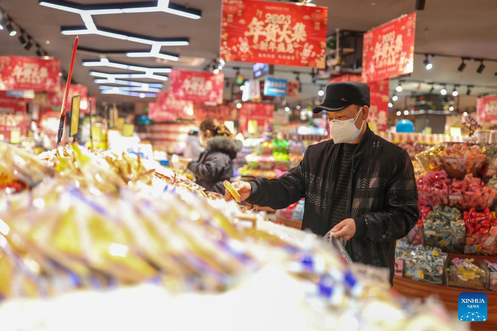 People select goods at a supermarket in Yuping Dong Autonomous County of Tongren City, southwest China's Guizhou Province, Jan. 1, 2023. (Photo by Hu Panxue/Xinhua)
