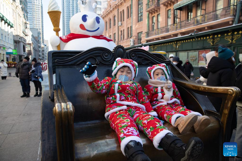 Children have fun on the Central Street in Harbin, northeast China's Heilongjiang Province, Jan. 1, 2023. (Xinhua/Zhang Tao)