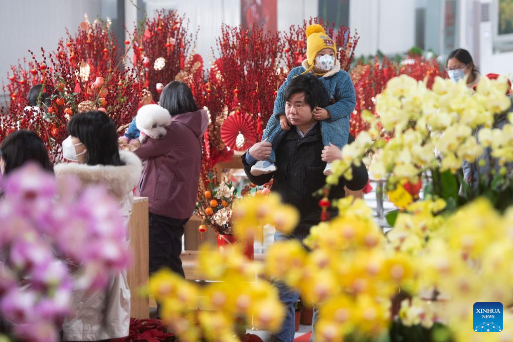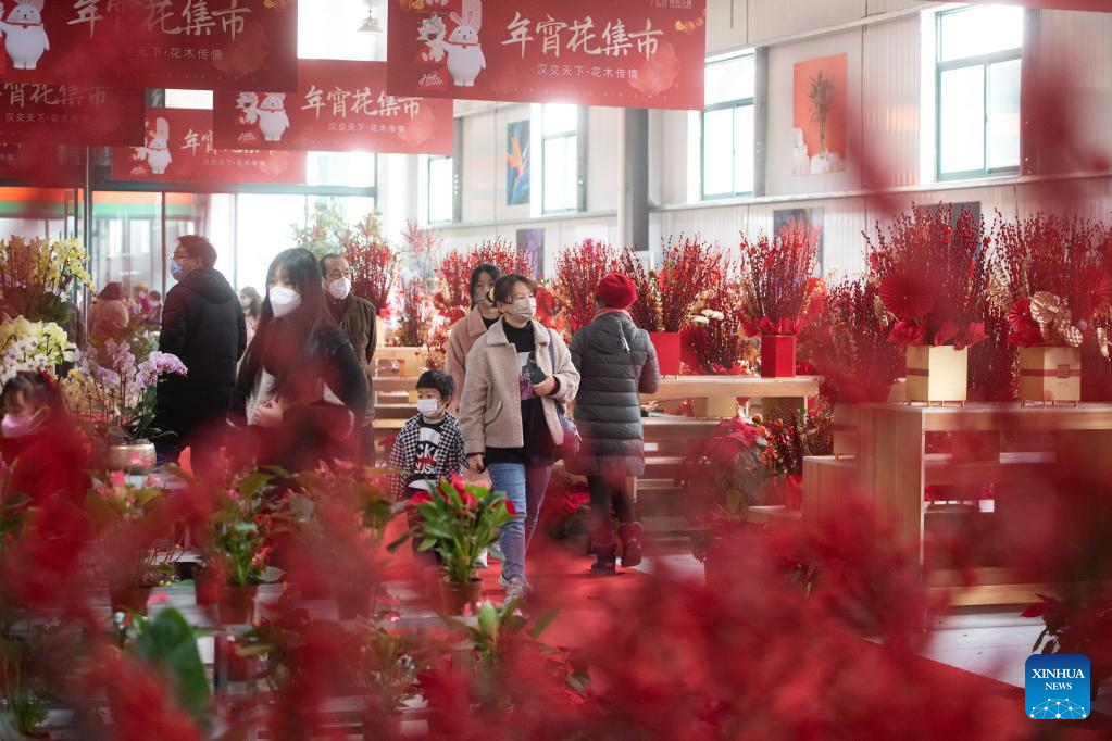 People visit a flower market in Wuhan, central China's Hubei Province, Jan. 1, 2023. (Xinhua/Xiao Yijiu)