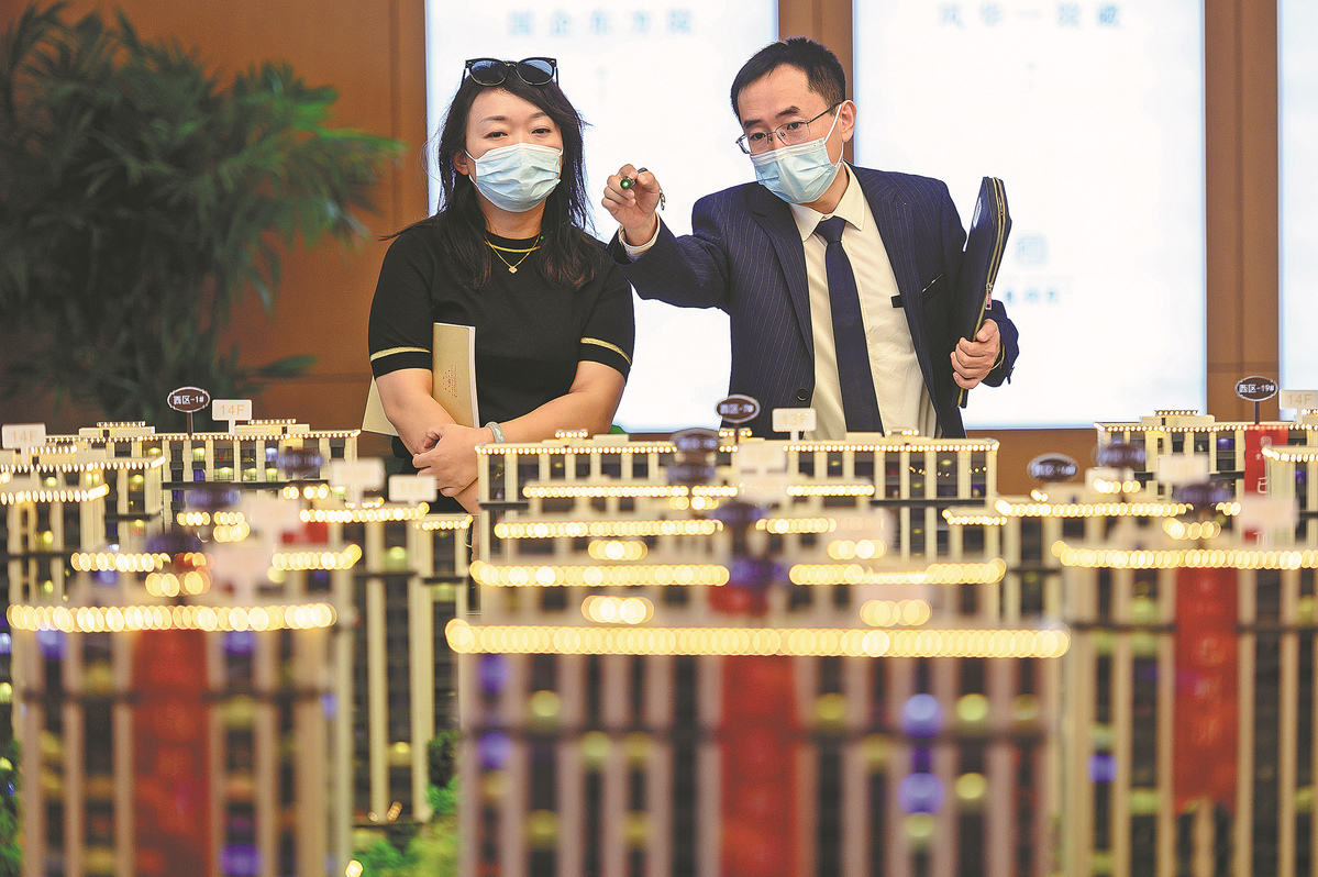 A potential homebuyer (left) looks at a property model in Taiyuan, Shanxi province. [WEI LIANG/CHINA NEWS SERVICE]