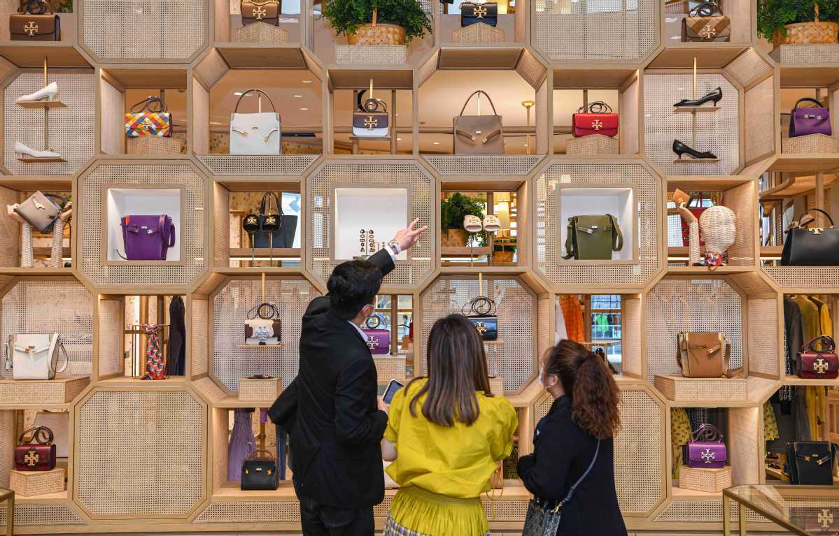 Consumers browse products at the Haikou International Duty Free City in Hainan province in October, 2022. The major international duty-free shopping complex, as one of the largest of its kind globally, integrates duty-free zones, offices, apartments, relaxation and entertainment areas. SU BIKUN/FOR CHINA DAILY