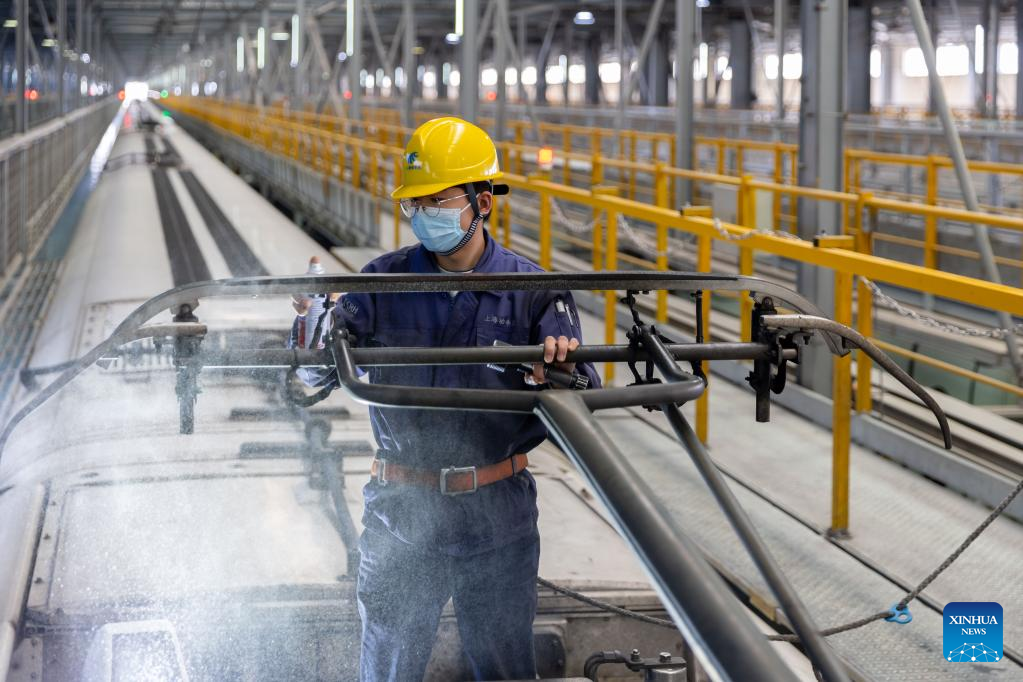 A worker carries out maintenance at the Hongqiao high-speed train depot in east China's Shanghai, Jan. 3, 2023. (Xinhua/Wang Xiang)