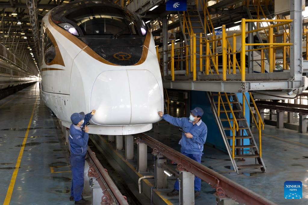 Railway workers of the Hongqiao high-speed train depot have stepped up their efforts on maintenance work for trains to prepare for the future travel rush during the Chinese Lunar New Year.