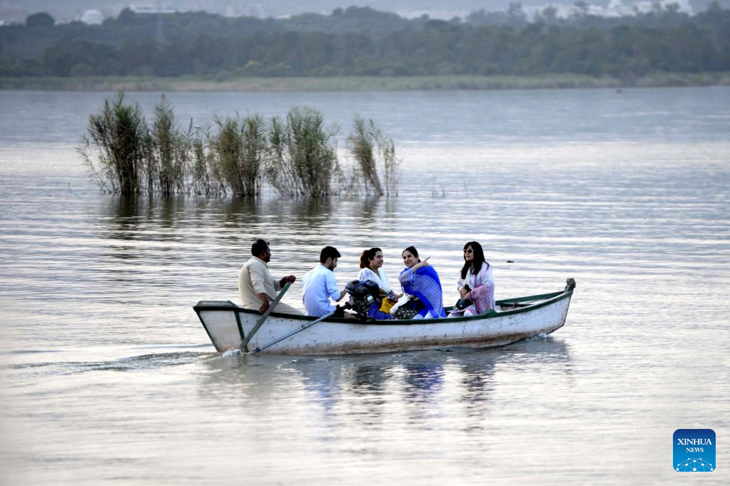 People enjoy boat ride on a lake in Islamabad, capital of Pakistan, Sept. 26, 2020. (Xinhua/Ahmad Kamal)