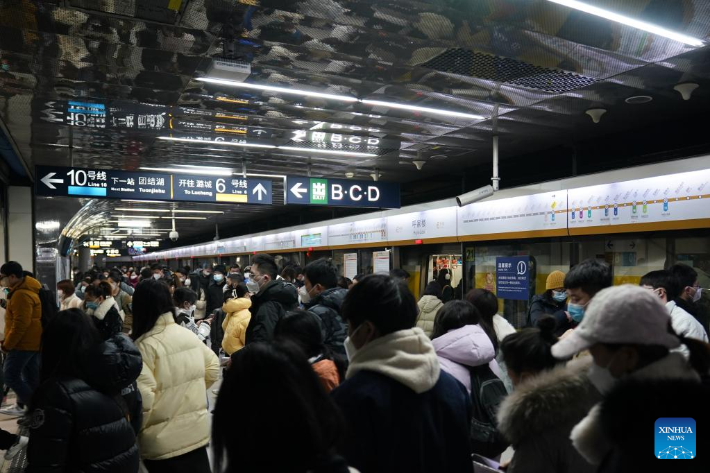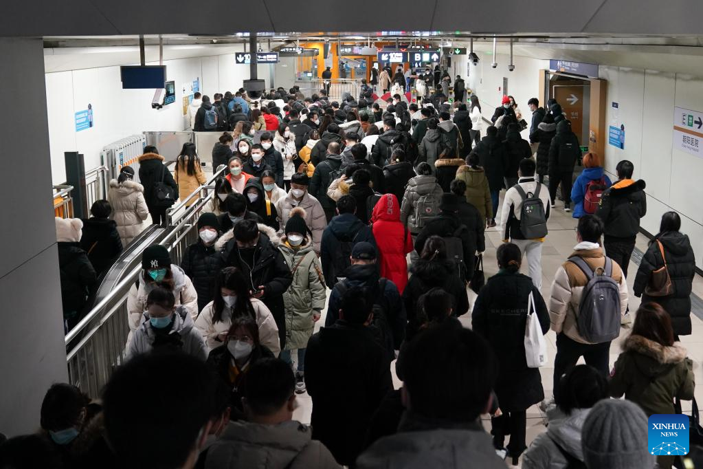 Passengers are seen at Hujialou Subway Station during morning peak hours in Beijing, capital of China, Jan. 3, 2023. (Xinhua/Ju Huanzong)