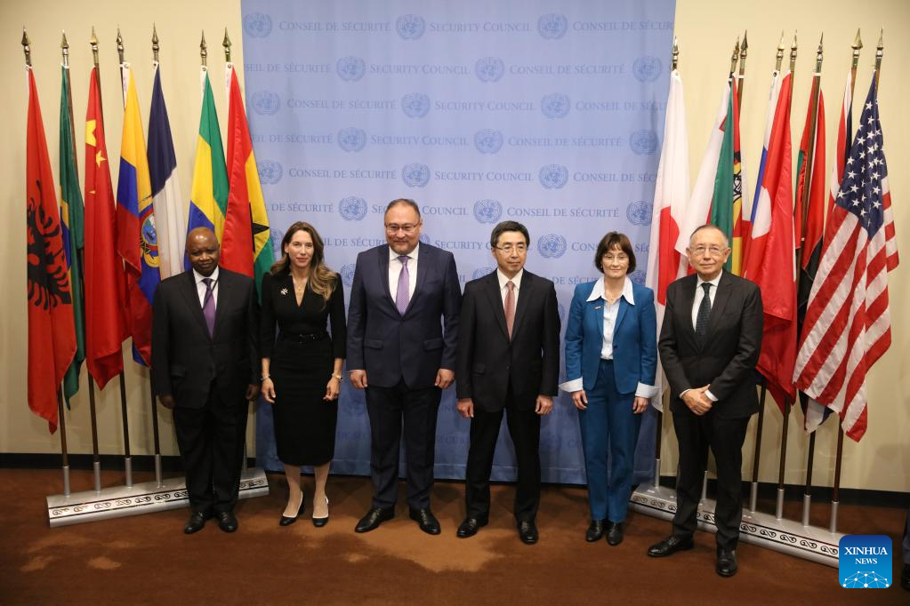 Kazakhstan's permanent representative Akan Rakhmetullin (3rd L) and permanent representatives of the five new UN Security Council members attend a flag installation ceremony at the UN headquarters in New York, on Jan. 3, 2023. (Xinhua/Xie E)