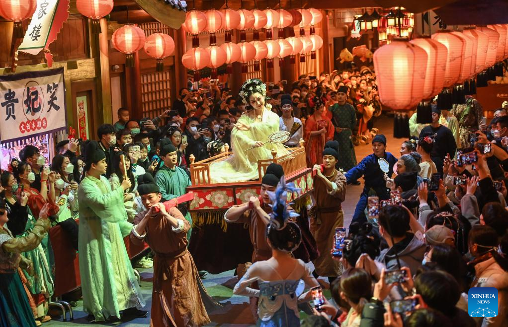 Tourists watch a performance at a theme community of Tang Dynasty in Xi'an, northwest China's Shaanxi Province, Dec. 31, 2022. (Photo by Zou Jingyi/Xinhua)