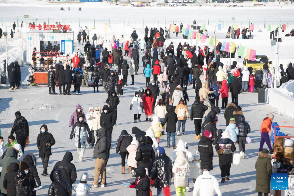 Tourists play at the Ice and Snow Carnival park on the Songhua River in Harbin, northeast China's Heilongjiang Province, Jan. 1, 2023. (Xinhua/Zhang Tao)