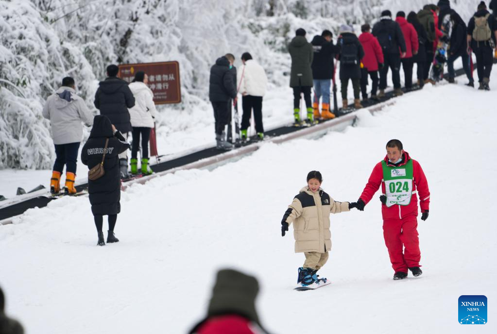 A young tourist practices skiing under the guidance of an instructor at a ski resort in Chongqing, southwest China, Jan. 1, 2023. (Xinhua/Liu Chan)