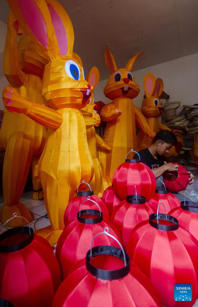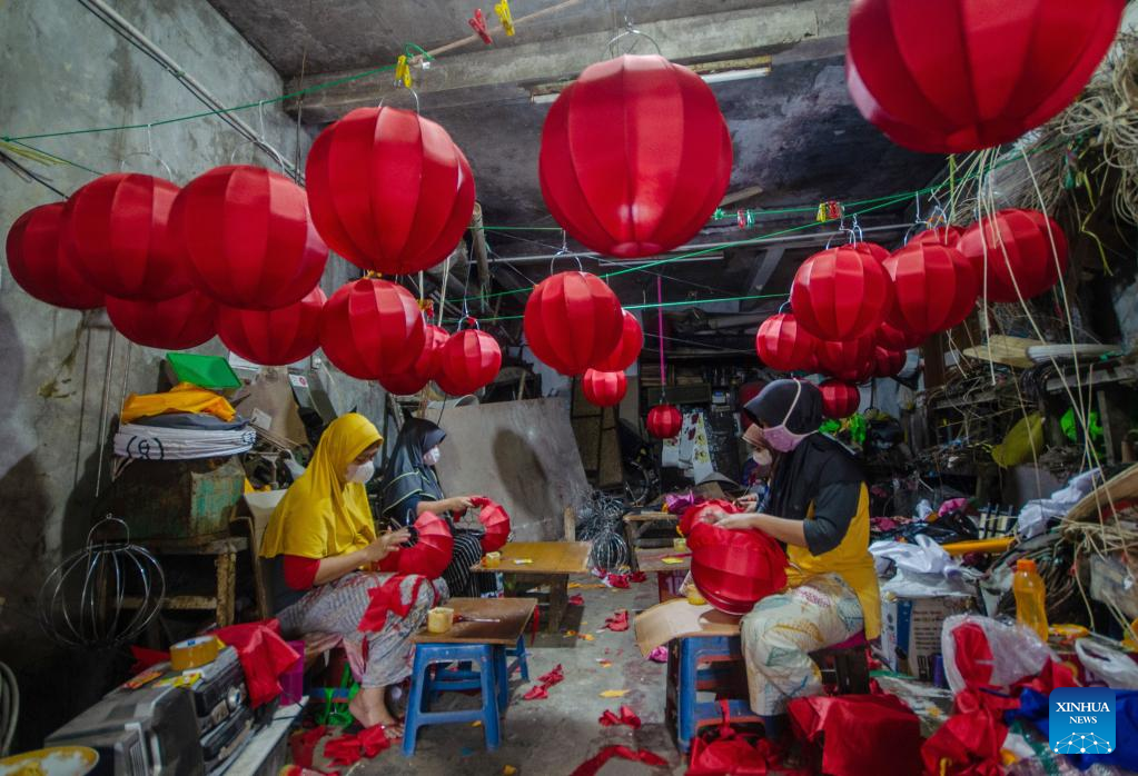 Workers make lanterns for the upcoming Chinese Lunar New Year at a workshop in Bandung, Indonesia, Jan. 3, 2023. (Photo by Septianjar Muharam/Xinhua)