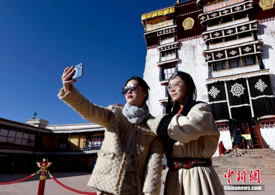Tourists take selfies at the Potala Palace in Lhasa, southwest China's Tibet Autonomous Region, Jan. 3, 2023. (Photo: China News Service/Li Lin)