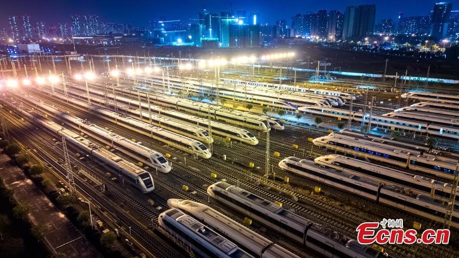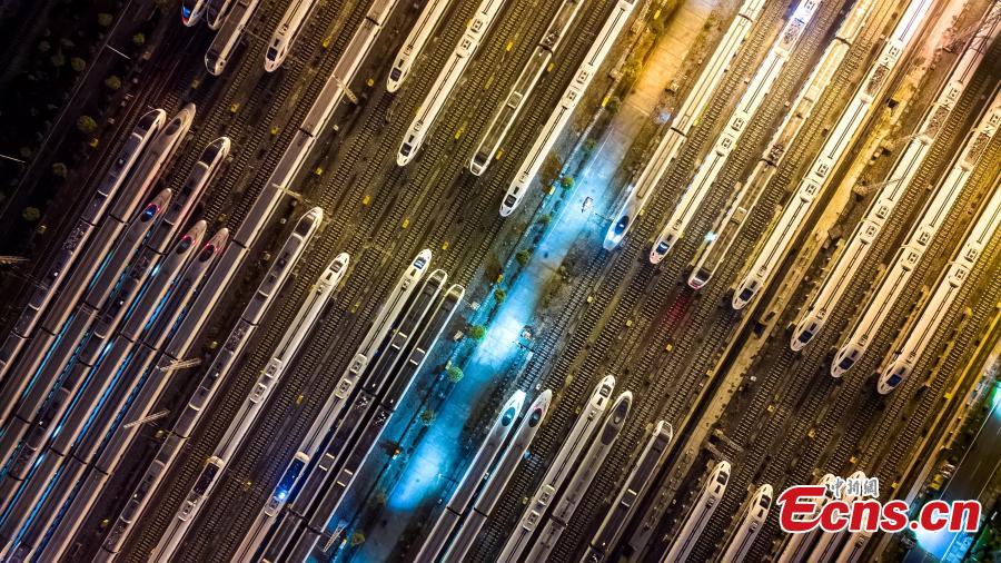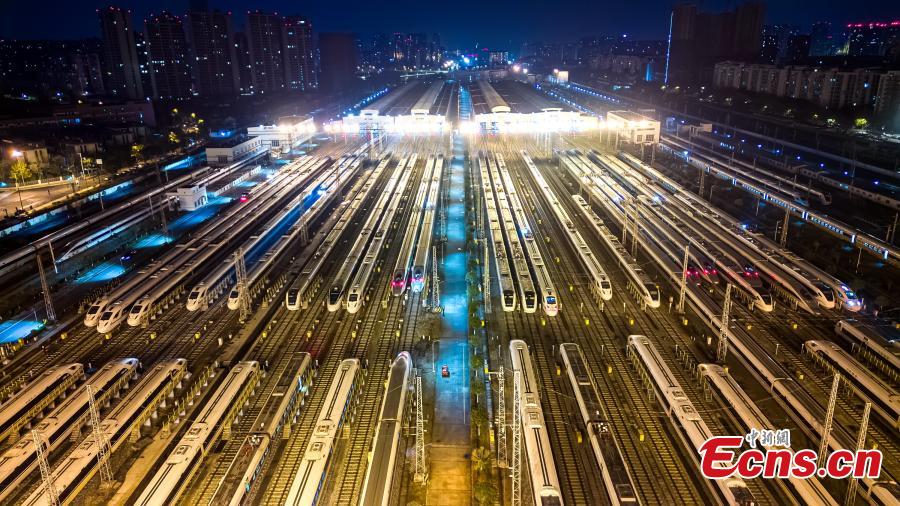 High-speed bullet trains are ready for service on storage tracks as inspection and preparation work wraps up at a maintenance base in Chengdu, southwest China's Sichuan Province on Jan. 3, 2023. (Photo: China News Service/Xiong Neng)