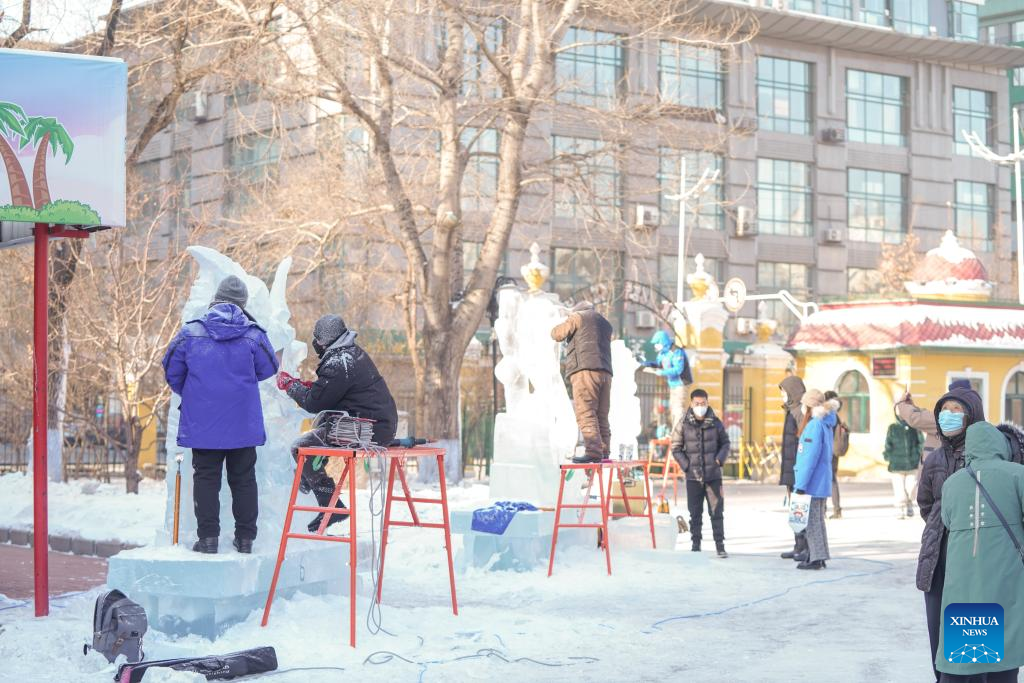 Contestants work on ice sculptures during a competition at an ice lantern fair in Harbin, northeast China's Heilongjiang Province, Jan. 4, 2023. (Xinhua/Wang Song)