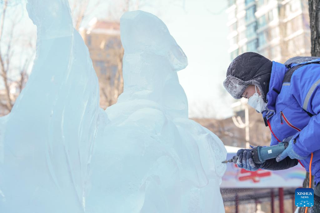 A contestant works on an ice sculpture during a competition at an ice lantern fair in Harbin, northeast China's Heilongjiang Province, Jan. 4, 2023. (Xinhua/Wang Song)