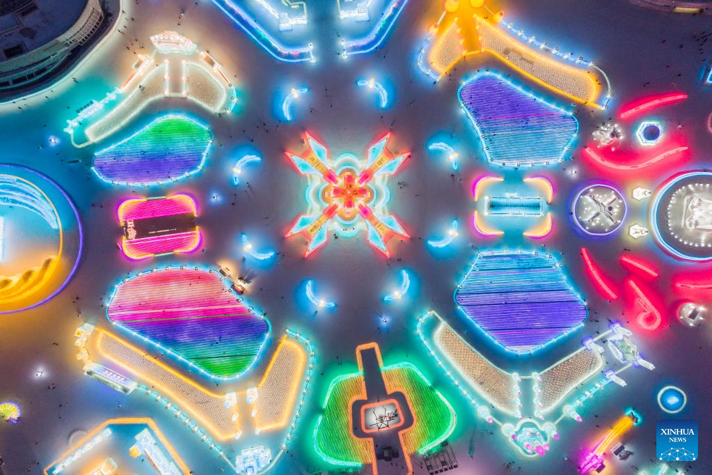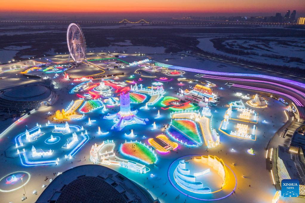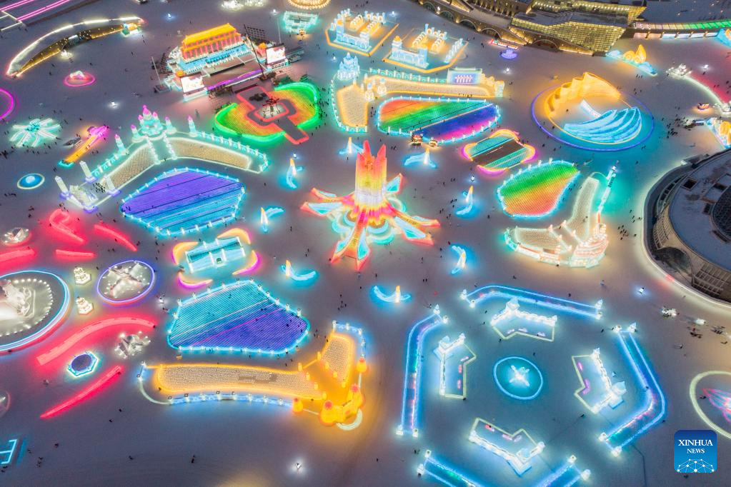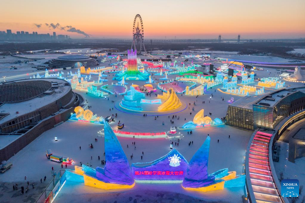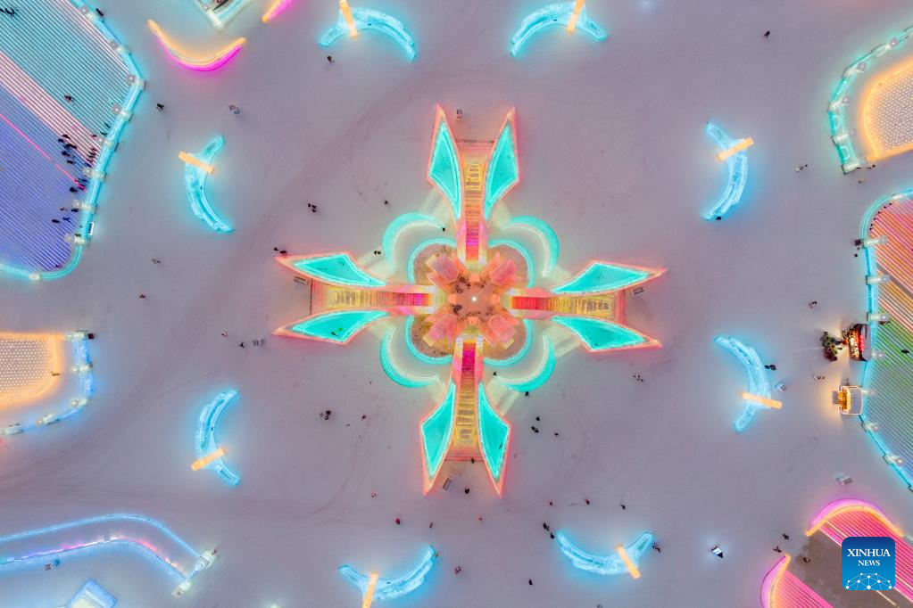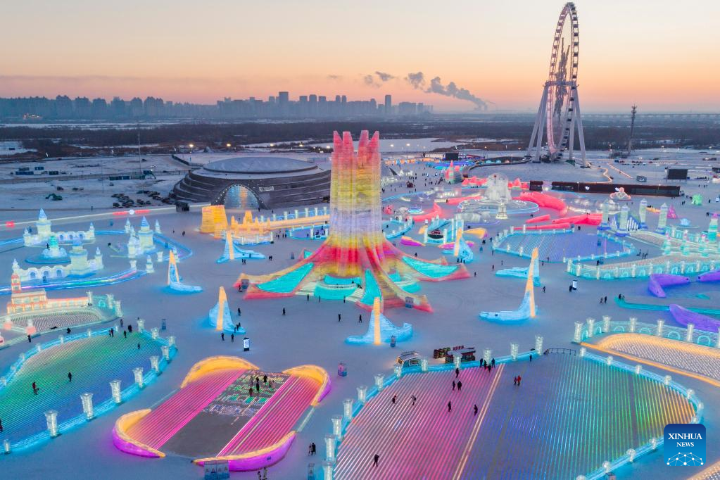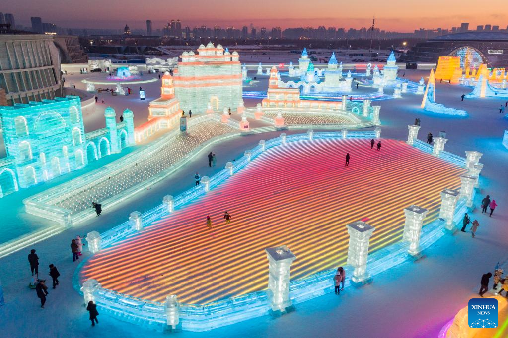This aerial photo taken on Jan. 3, 2023 shows tourists visiting the Harbin Ice-Snow World in Harbin, northeast China's Heilongjiang Province. (Xinhua/Xie Jianfei)
