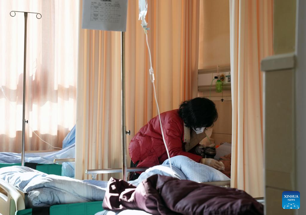 A woman tends her 90-year-old mother at a ward of a community healthcare institution in Jiuting Town of Songjiang District, east China's Shanghai, Jan. 4, 2023. (Xinhua/Liu Ying)