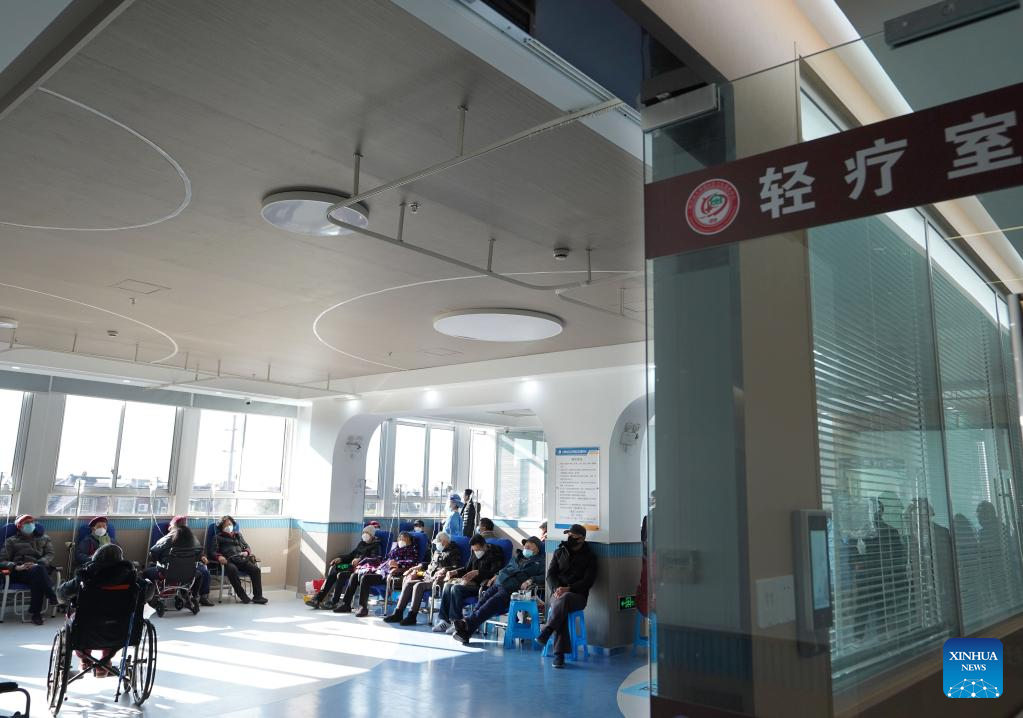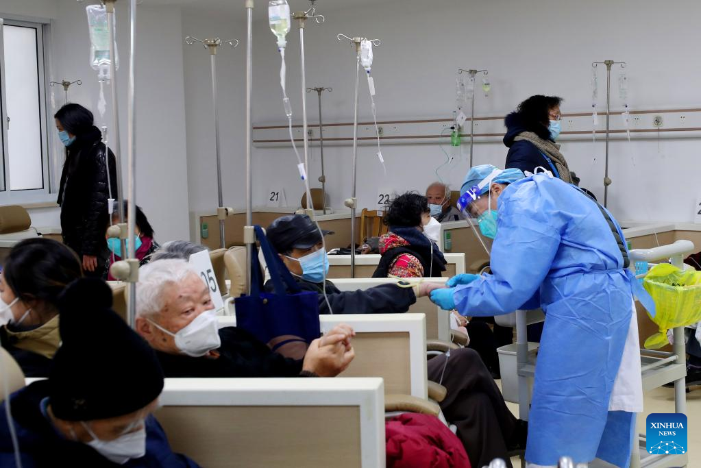 Patients are treated with intravenous infusion in a community healthcare institution in Jiuting Town of Songjiang District, east China's Shanghai, Jan. 4, 2023. (Xinhua/Liu Ying)