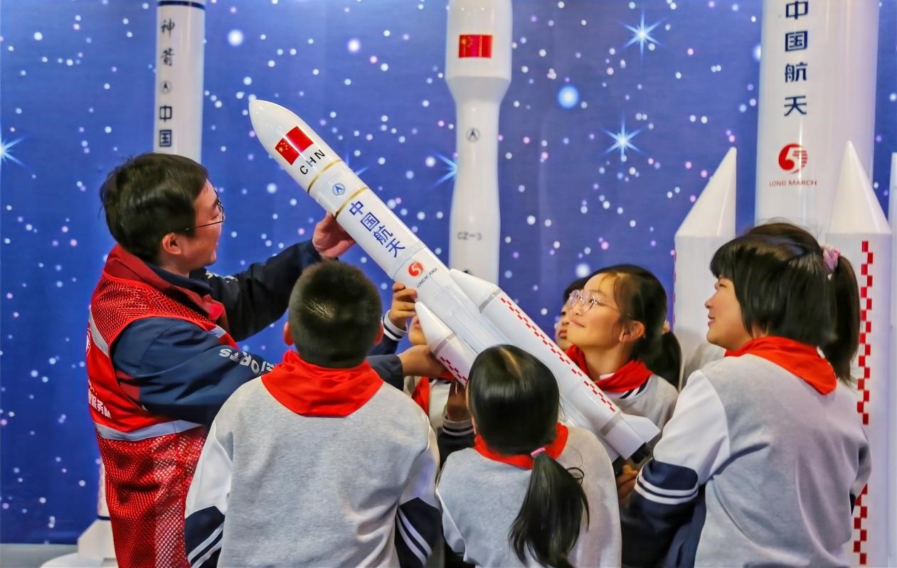 A volunteer (first from the left) shares knowledge of aerospace with local students, holding a model rocket, at a science and technology museum in Hai'an, east China's Jiangsu province, Dec. 8, 2022. (People's Daily Online/Zhou Qiang)