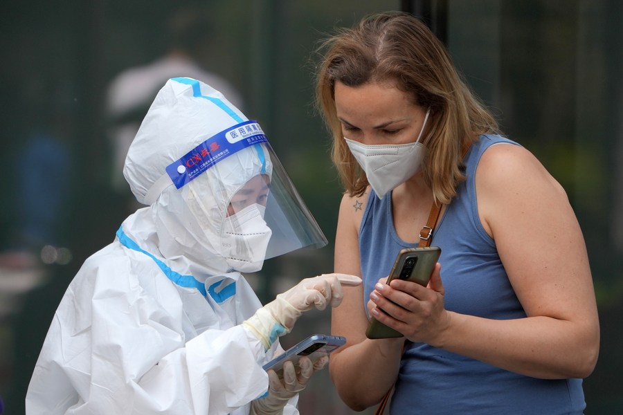 A volunteer helps a foreigner to check identity information at a COVID-19 test site in Chaoyang District, Beijing, capital of China, May 5, 2022. (Xinhua/Ju Huanzong)