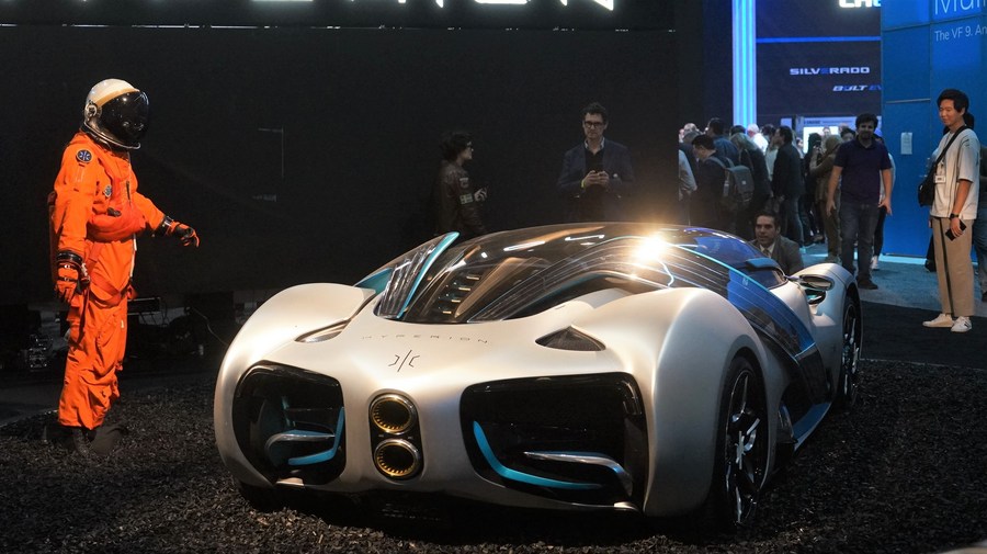 Visitors look at a new energy hypercar during a media preview at the 2022 Los Angeles Auto Show in Los Angeles, the United States, Nov. 17, 2022. (Photo by Zeng Hui/Xinhua)