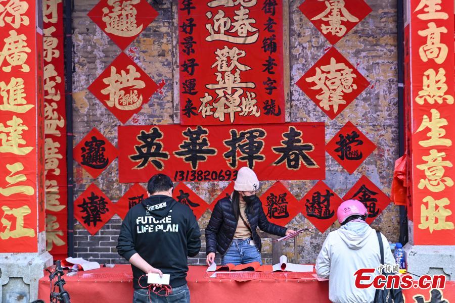 Customers select Spring Festival couplets to greet the Chinese Lunar New Year, or Spring Festival, in Guangzhou, south China's Guangdong Province, Jan. 4, 2023. (Photo: China News Service/Chen Jimin)