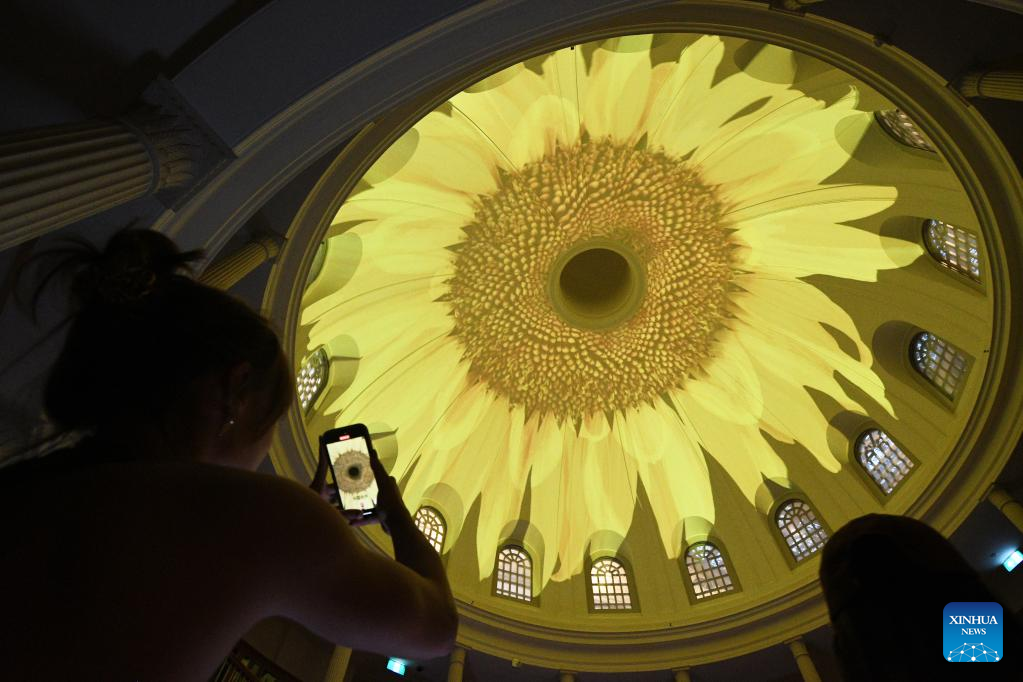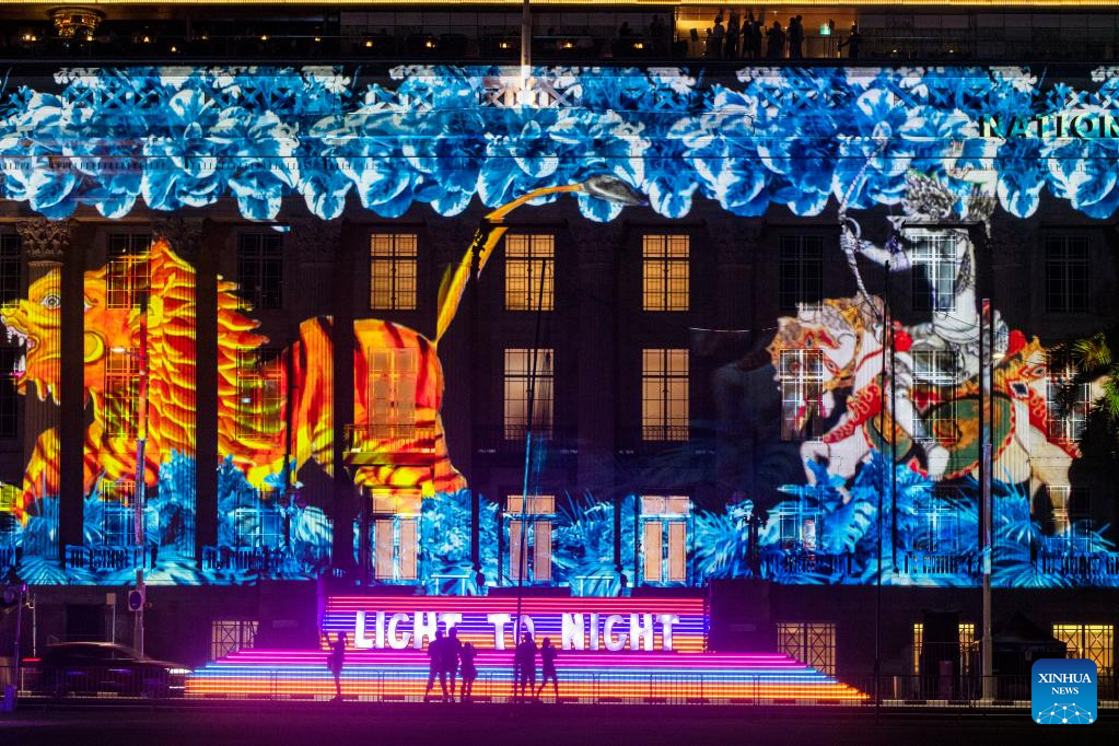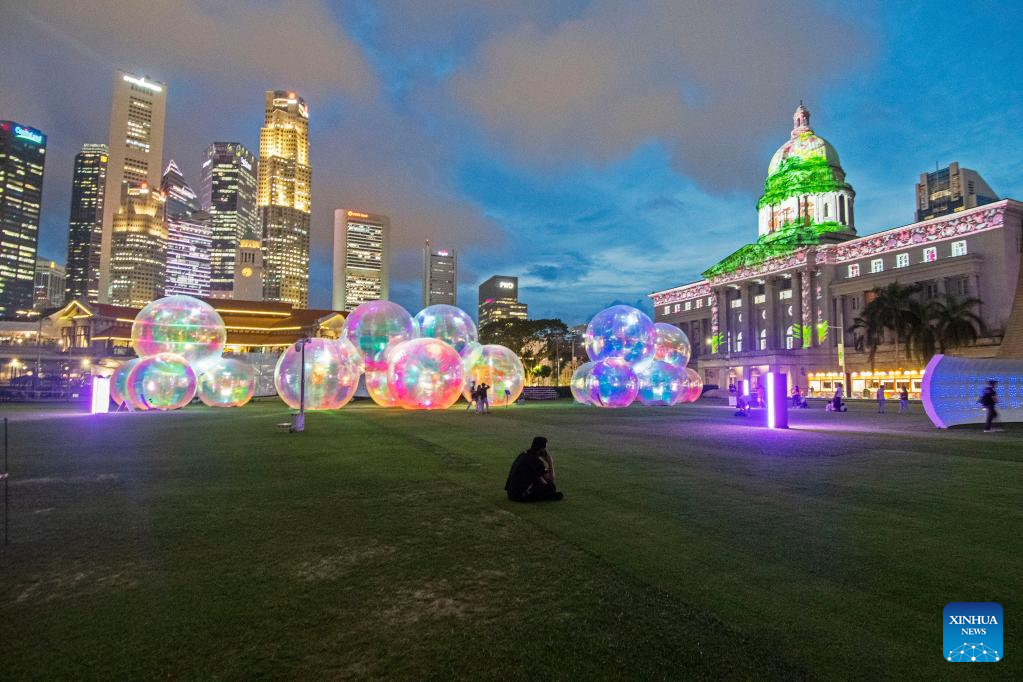 People view light installations during a media preview of the Light to Night Festival at Singapore's Civic District, Jan. 4, 2023. (Photo by Then Chih Wey/Xinhua)