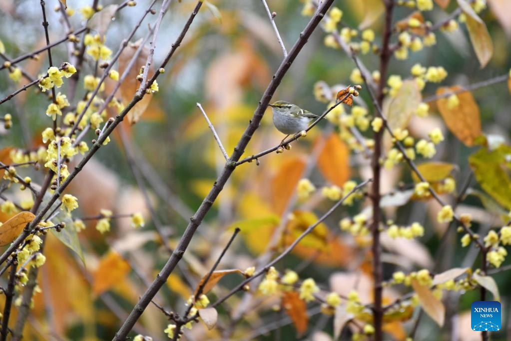 A bird perches on a branch of wintersweet in Renhuai, southwest China's Guizhou Province, Jan. 5, 2023. (Photo by Chen Yong/Xinhua)