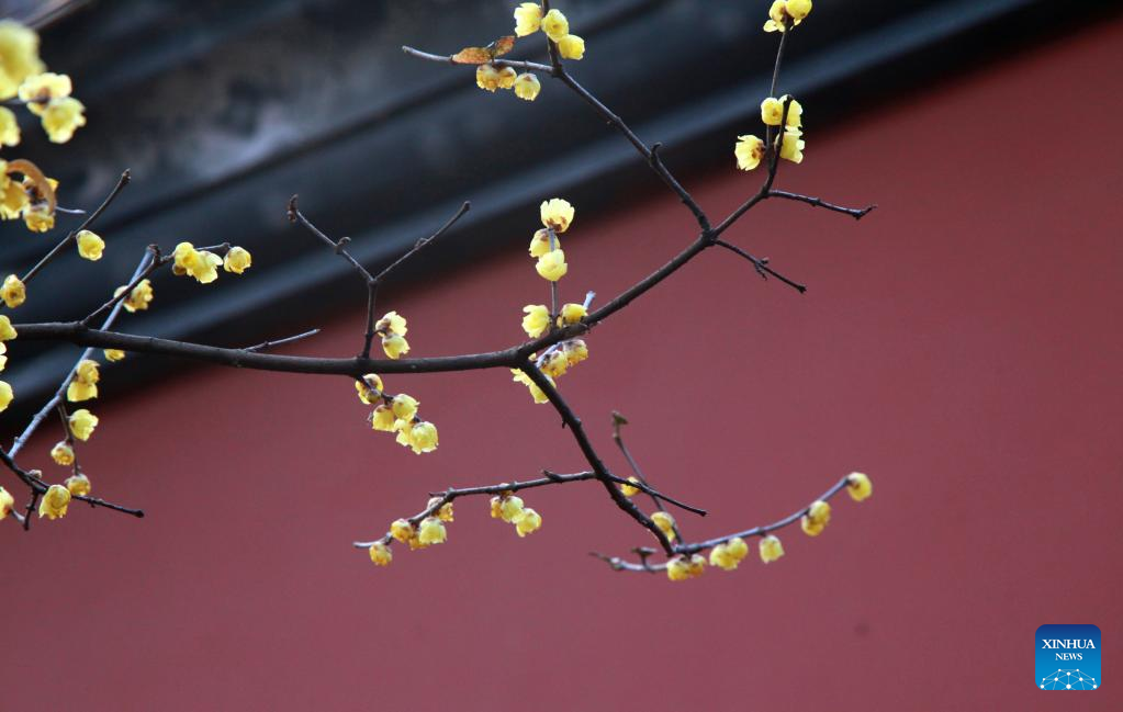 Wintersweet flowers are pictured at the scenic spot of the imperial Xiaoling Mausoleum in Nanjing, capital of east China's Jiangsu Province, Jan. 5, 2023. (Photo by Liu Jianhua/Xinhua)