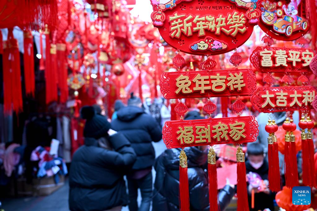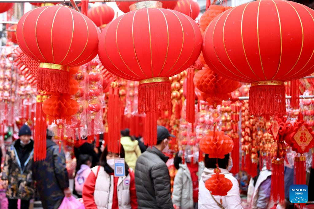 People shop for decorations for the upcoming Chinese New Year in Hefei, east China's Anhui Province, Jan. 5, 2023. (Xinhua/Huang Bohan)