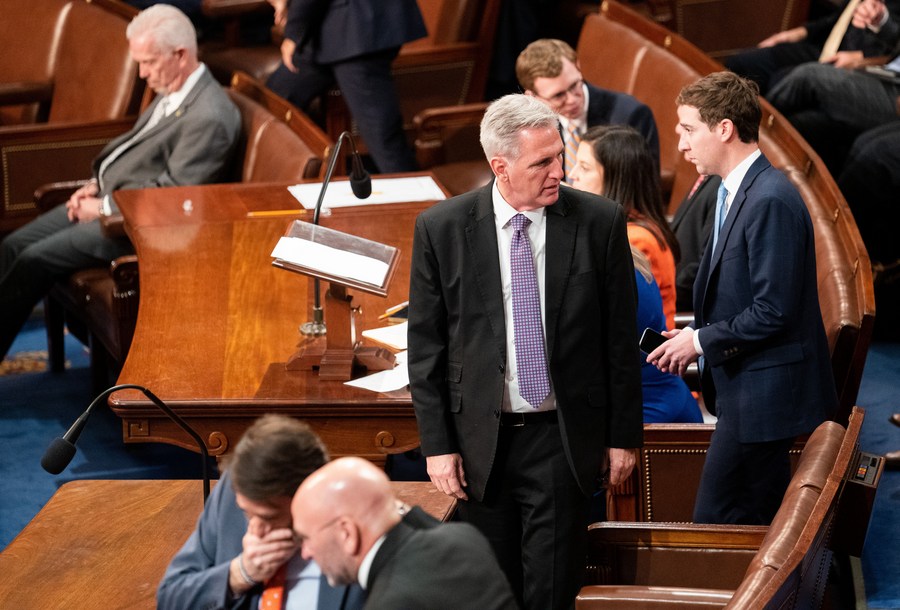 U.S. Congressman Kevin McCarthy arrives at the House chamber as the House meets for a second day to elect a speaker in Washington, D.C., the United States, Jan. 4, 2023. (Xinhua/Liu Jie)