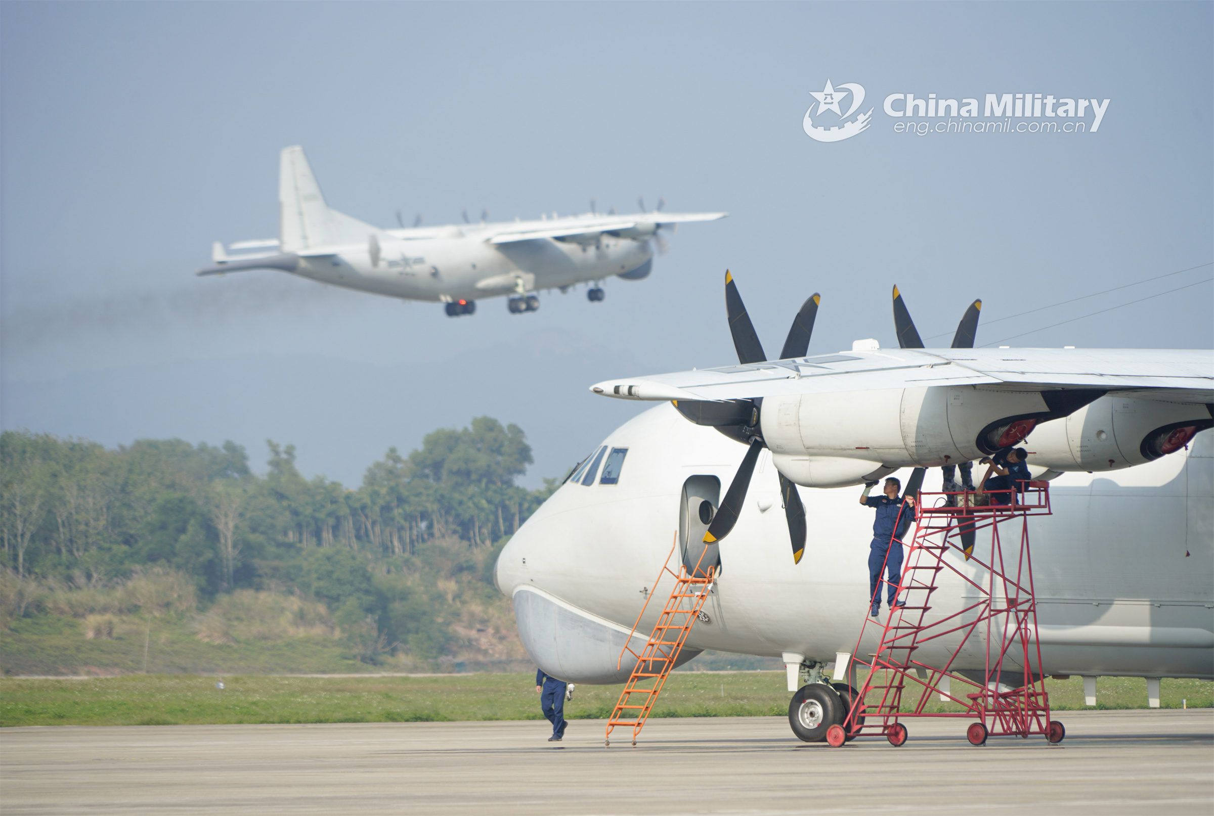 Ground crew members assigned to an aviation regiment of the naval force under the PLA Southern Theater Command maintain an antisubmarine aircraft during an antisubmarine flight training exercise in late December, 2022. (eng.chinamil.com.cn/Photo by Qin Qianjiang)