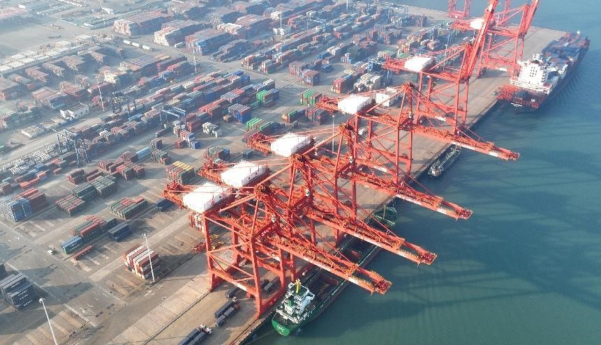 Photo taken on Dec. 7, 2022 shows a busy scene at a container terminal of the Lianyungang Port in east China's Jiangsu province. (People's Daily Online/Geng Yuhe)