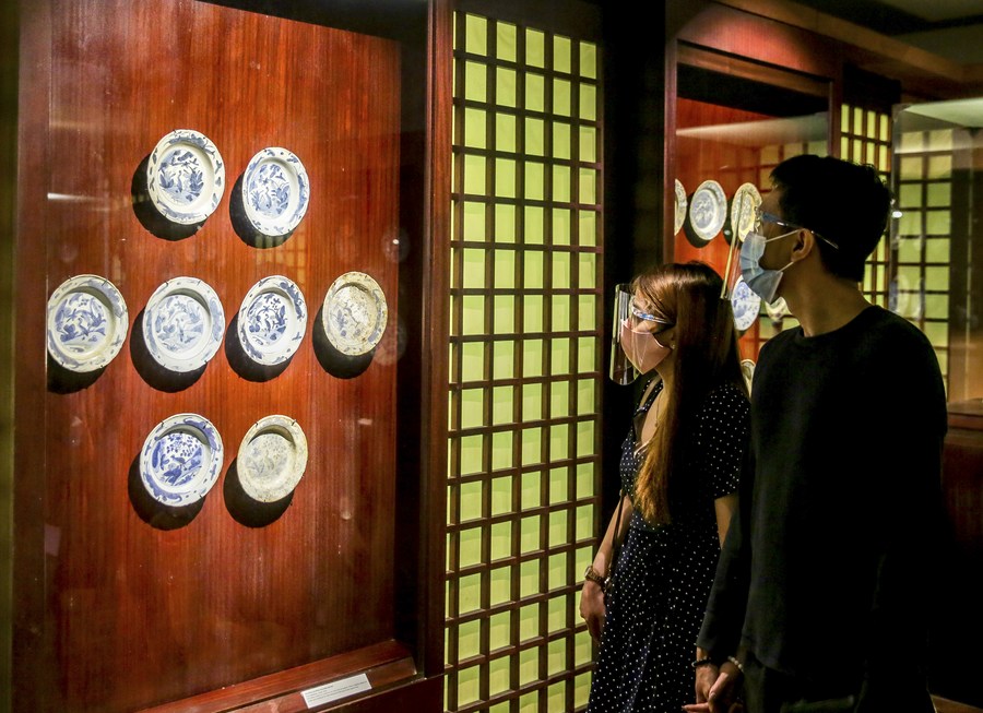 Visitors view ancient Chinese ceramics at the Philippine National Museum of Anthropology in Manila, the Philippines on July 25, 2021. (Photo by Rouelle Umali/Xinhua)