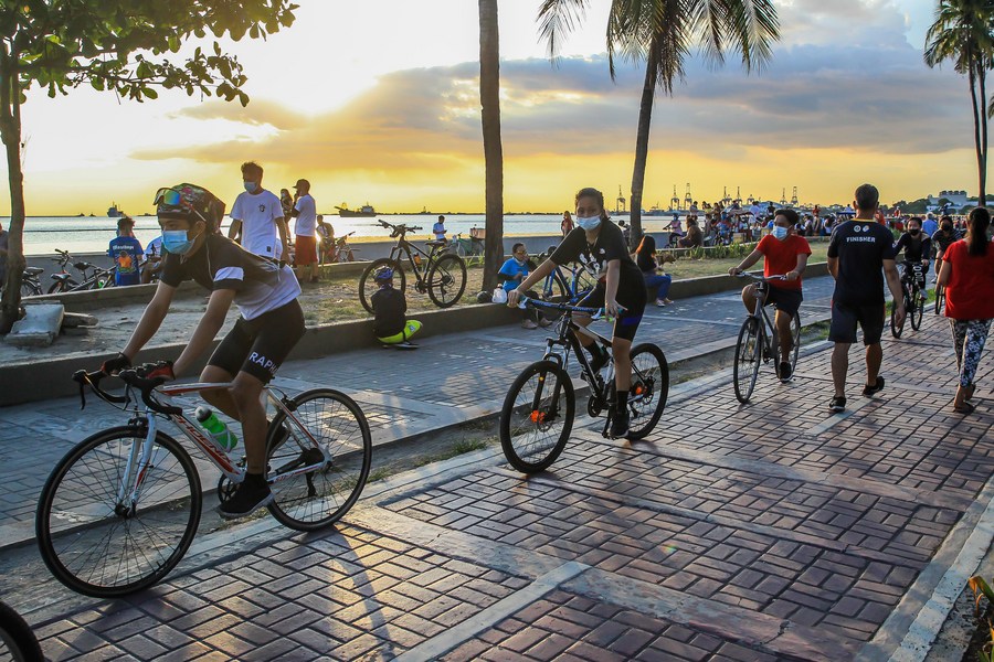 People ride bicycles in sunset at Manila Bay in Manila, the Philippines on May 15, 2021. (Photo by Rouelle Umali/Xinhua)