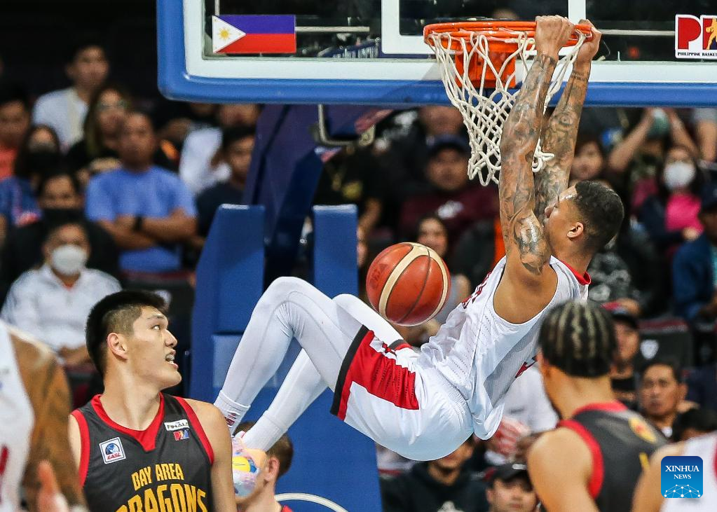 Jamie Malonzo (above) of Barangay Ginebra San Miguel dunks during the game 4 between Barangay Ginebra San Miguel and Bay Area Dragons at the Commissioner's Cup Finals of the Philippine Basketball Association (PBA) in Pasay City, the Philippines, on Jan. 6, 2023. (Xinhua/Rouelle Umali)