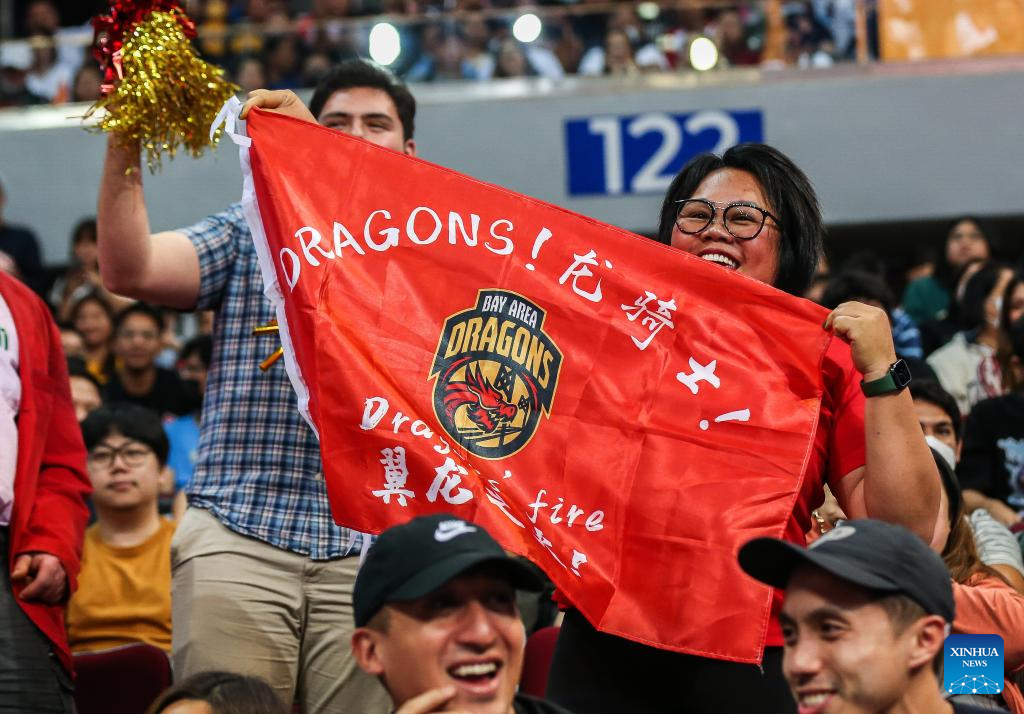 Fans of Bay Area Dragons react during the game 4 between Barangay Ginebra San Miguel and Bay Area Dragons at the Commissioner's Cup Finals of the Philippine Basketball Association (PBA) in Pasay City, the Philippines, on Jan. 6, 2023. (Xinhua/Rouelle Umali)
