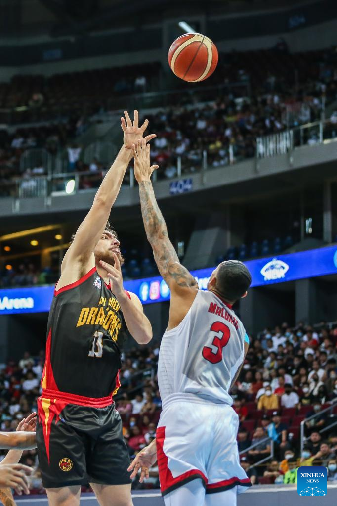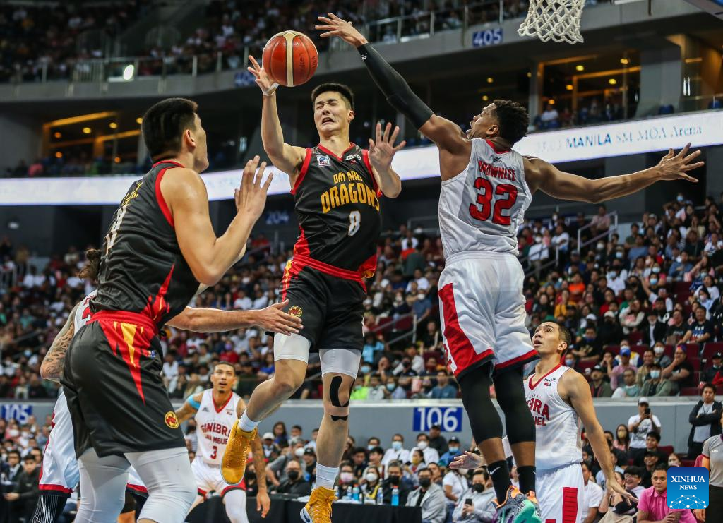 Zhu Songwei (C) of Bay Area Dragons competes during the game 4 between Barangay Ginebra San Miguel and Bay Area Dragons at the Commissioner's Cup Finals of the Philippine Basketball Association (PBA) in Pasay City, the Philippines, on Jan. 6, 2023. (Xinhua/Rouelle Umali)