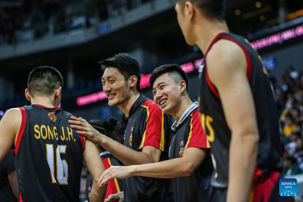 Glen Robertson Yang (2nd R) of Bay Area Dragons celebrates for victory after during the game 4 between Barangay Ginebra San Miguel and Bay Area Dragons at the Commissioner's Cup Finals of the Philippine Basketball Association (PBA) in Pasay City, the Philippines, on Jan. 6, 2023. (Xinhua/Rouelle Umali)