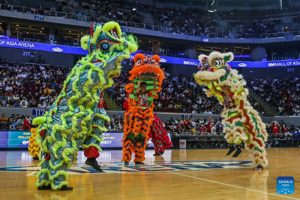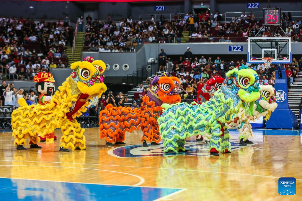 Lion dancers perform during the halftime of the game 4 between Barangay Ginebra San Miguel and Bay Area Dragons at the Commissioner's Cup Finals of the Philippine Basketball Association (PBA) in Pasay City, the Philippines, on Jan. 6, 2023. (Xinhua/Rouelle Umali)