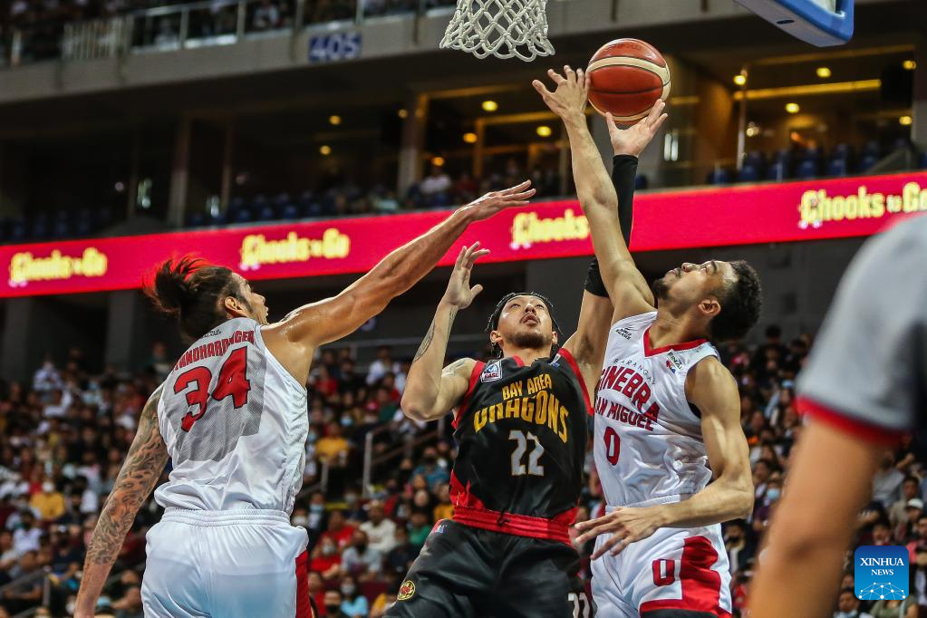 Kobey Ketavong Lam (C) of Bay Area Dragons competes during the game 4 between Barangay Ginebra San Miguel and Bay Area Dragons at the Commissioner's Cup Finals of the Philippine Basketball Association (PBA) in Pasay City, the Philippines, on Jan. 6, 2023. (Xinhua/Rouelle Umali)