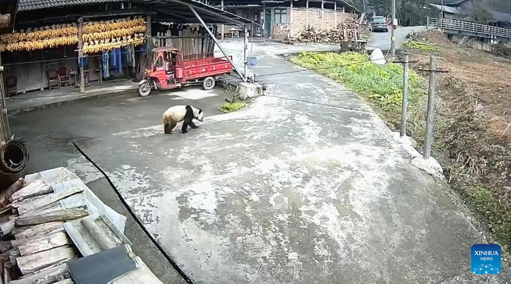 This video screenshot shows a wild giant panda walking in Xiaohe Village of Lushan County in Ya'an City, southwest China's Sichuan Province, Jan. 5, 2023.(Xinhua)